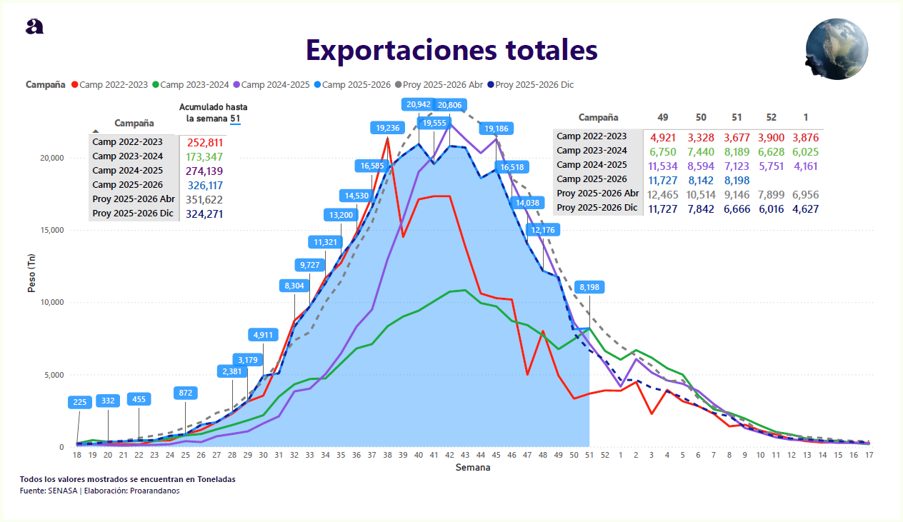 Perú cierra la semana 51 con 326.117 toneladas (+19%), muy cerca de la proyección revisada en diciembre. El dato ratifica su rol como principal abastecedor global del arándano y consolida una ventana exportadora de alta intensidad entre las semanas 35 y 51.