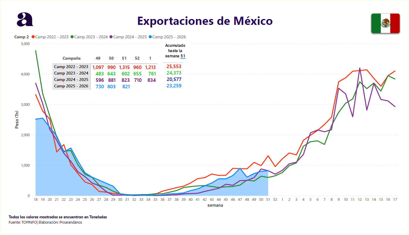 México suma 23.259 toneladas (+13%) a la semana 51 y entra en su fase ascendente. Su relevancia estratégica está en su ventana de suministro (semanas 1–20), cuando los orígenes del hemisferio sur reducen su presencia, y su cercanía logística suele influir en el piso de precios en Estados Unidos durante el primer trimestre.