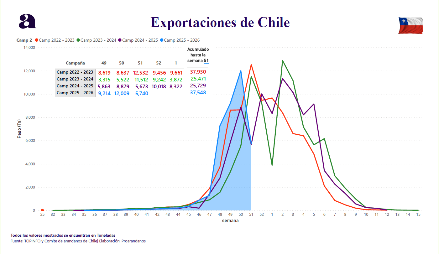Chile acumula 37.548 toneladas de arándanos a la semana 51, prácticamente igualando su máximo histórico reciente y mostrando un crecimiento de 46% frente a la campaña anterior. Este repunte reposiciona al país en la ventana de fin de año, con impacto directo en la dinámica competitiva del arándano en Europa y Estados Unidos.