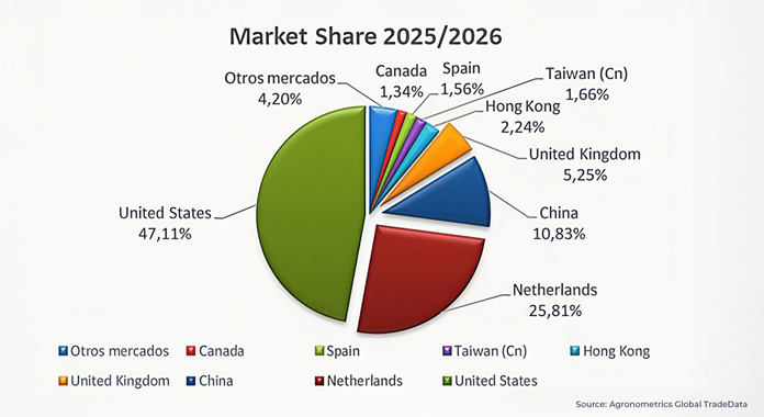 El avance del mercado británico ocurre en un contexto donde Países Bajos mantiene un rol dominante como hub europeo, con una participación elevada en el mix de destinos. Esta arquitectura logística favorece una redistribución más eficiente dentro del continente y facilita el abastecimiento continuo de mercados como Reino Unido.