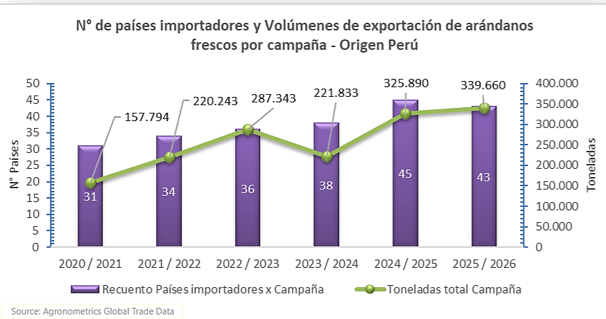 Estados Unidos mantiene el liderazgo del arándano peruano, aunque en el último corte su participación se sitúa en 47,1%, un nivel inferior al rango observado en temporadas previas, cuando se mantuvo de forma más estable por sobre la mitad del total.