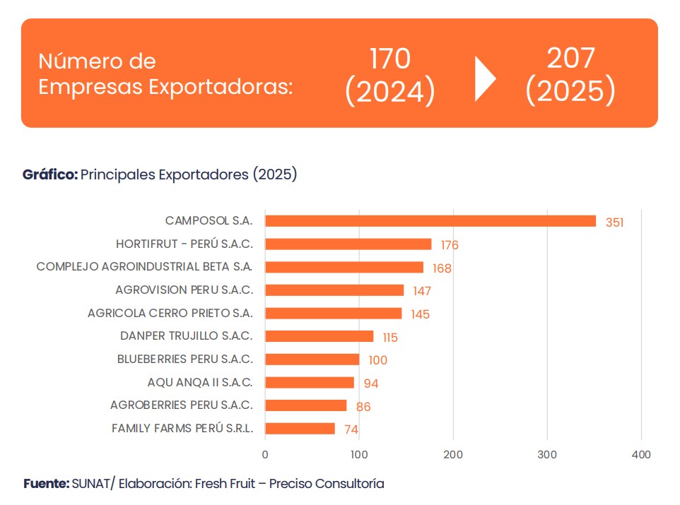 El número de empresas que participan en la exportación de arándanos también aumentó, según el mismo informe. Se suman nuevos actores, pero la escala del negocio sigue concentrada: el grupo de compañías líderes continúa explicando una fracción relevante del valor total, combinando superficie propia, programas de largo plazo y fuerte integración con los mercados de destino.