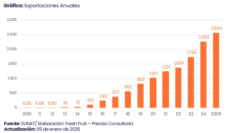 De acuerdo con datos publicados por FreshFruit, en 2025 el Perú exportó alrededor de 412 mil toneladas de arándanos frescos, por un valor cercano a US$ 2.560 millones. Esto supone un incremento de dos dígitos tanto en volumen como en valor respecto de 2024, con un precio promedio anual en torno a los US$ 6,2/kg, levemente inferior al del año previo.