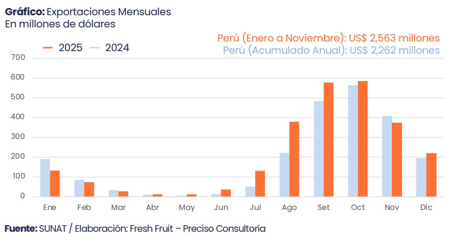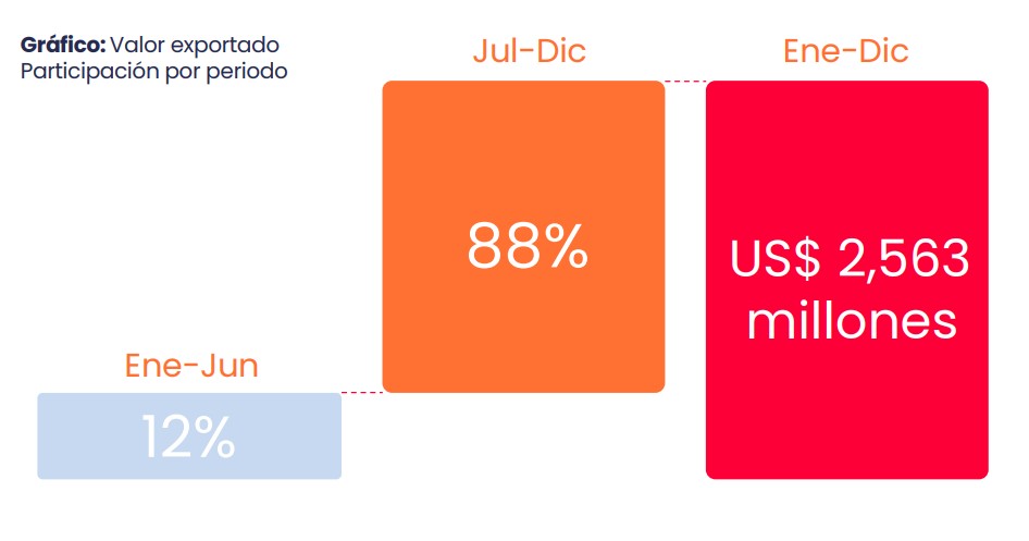 El calendario confirma la alta concentración del arándano peruano. Entre agosto y noviembre se resolvió la mayor parte del valor exportado, mientras que el segundo semestre en su conjunto concentró casi todo el negocio, siempre según FreshFruit.