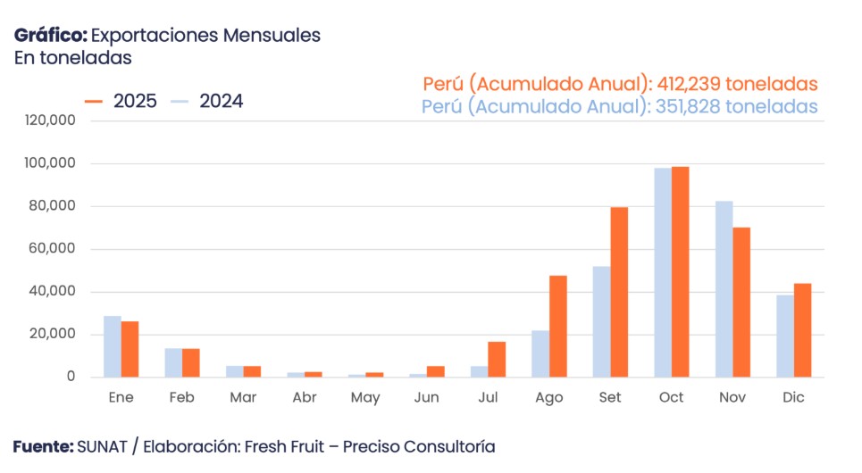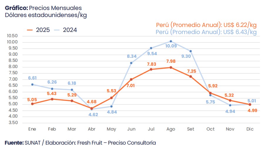 El descenso anual del precio promedio se explica, sobre todo, por lo ocurrido en el pico de la campaña. En agosto y septiembre el Perú colocó mucha más fruta que en 2024, y el mercado absorbió ese crecimiento principalmente recortando el valor por kilogramo.