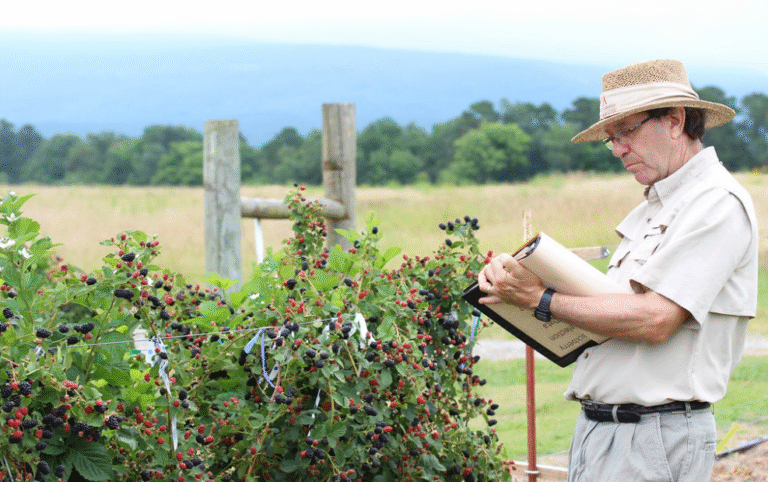 John Clark inspecciona plantas de mora en la Estación de Investigación Frutícola de la Estación Experimental Agrícola de Arkansas en Clarksville. © División de Agricultura del Sistema de la Universidad de Arkansas