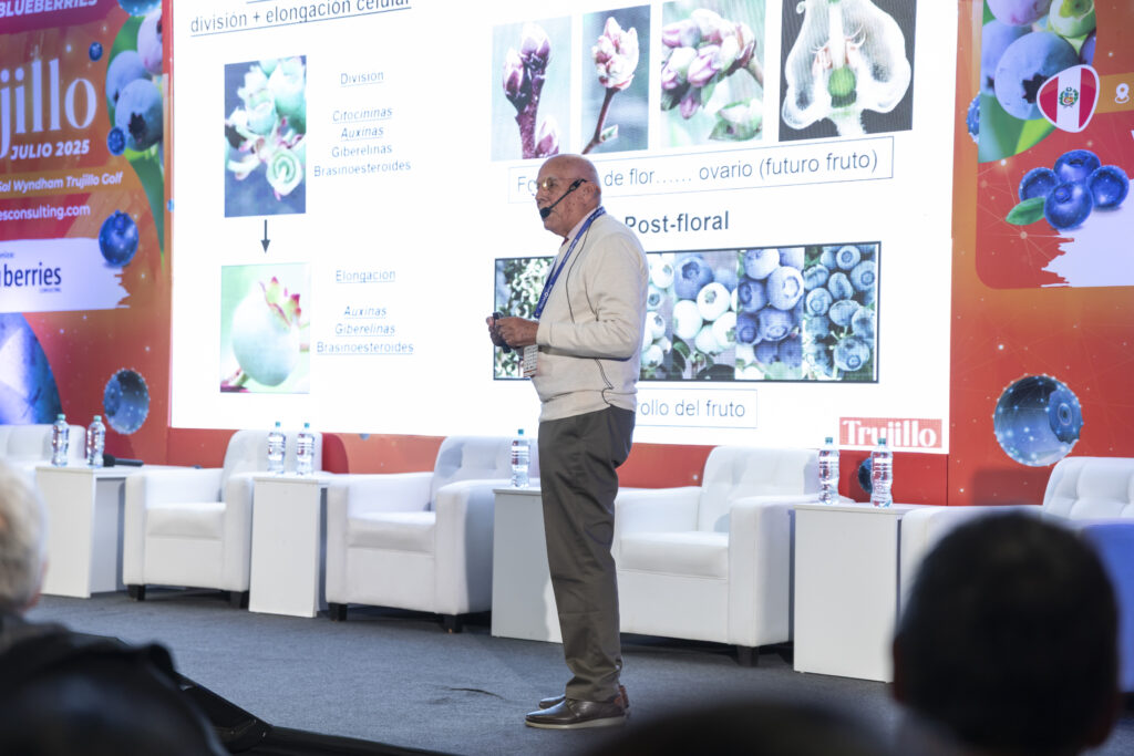 El investigador internacional, Daniel Díaz, ingeniero agrónomo y doctor en Fisiología Vegetal de Árboles Frutales en la Universidad Estatal de Michigan, señaló que una de las estrategias para combatir los efectos de las altas temperaturas es el uso de biorreguladores. Díaz participó en el mes de julio en el Seminario International Blueberries Trujillo 2025, realizado en Perú, donde abordó el tema del estrés térmico en los arándanos y el uso de biorreguladores para combatir esta contingencia.