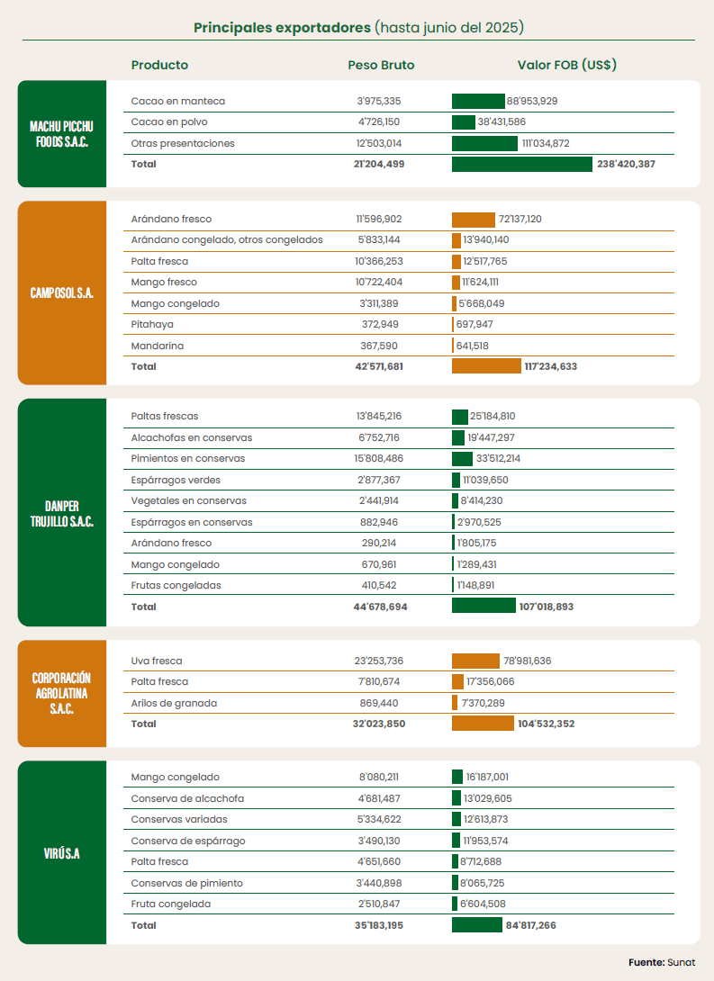Durante el primer semestre del 2025, la empresa que lidera las agroexportaciones peruanas es Machu Picchu Foods S.A.C., con envíos por un valor cercano a los US$ 238 millones. Sin embargo, dado la alta diversificación en productos y la gran cantidad de empresas en el mercado agroexportador peruano, esta cifra solo ronda el 4% de las agroexportaciones peruanas.