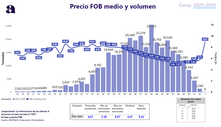 En este contexto, la semana 1 suele funcionar como una referencia de inicio más que como conclusión. Si el precio se sostiene, la discusión comercial se fortalece y se abren mejores condiciones para programas. Si corrige, el foco se desplaza hacia una ejecución más selectiva, donde destino, rotación y condición pasan a ser determinantes para capturar diferenciales.