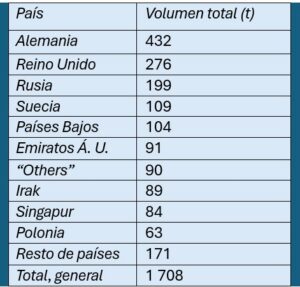 Las cifras reflejan un patrón de crecimiento acelerado seguido de ajustes. Alemania pasó de 60 toneladas en 2020/21 a 147 en 2023/24, estabilizándose luego en 58. Reino Unido, en cambio, mostró un despegue sostenido: de apenas 11 toneladas en 2020/21 a 158 en 2023/24, manteniendo 105 en la última campaña. Rusia y Suecia irrumpieron con fuerza en 2023/24, aunque redujeron volúmenes al año siguiente, mientras que el bloque “otros” cayó de 24 a 6 toneladas, reflejando una redirección hacia mercados más definidos.
