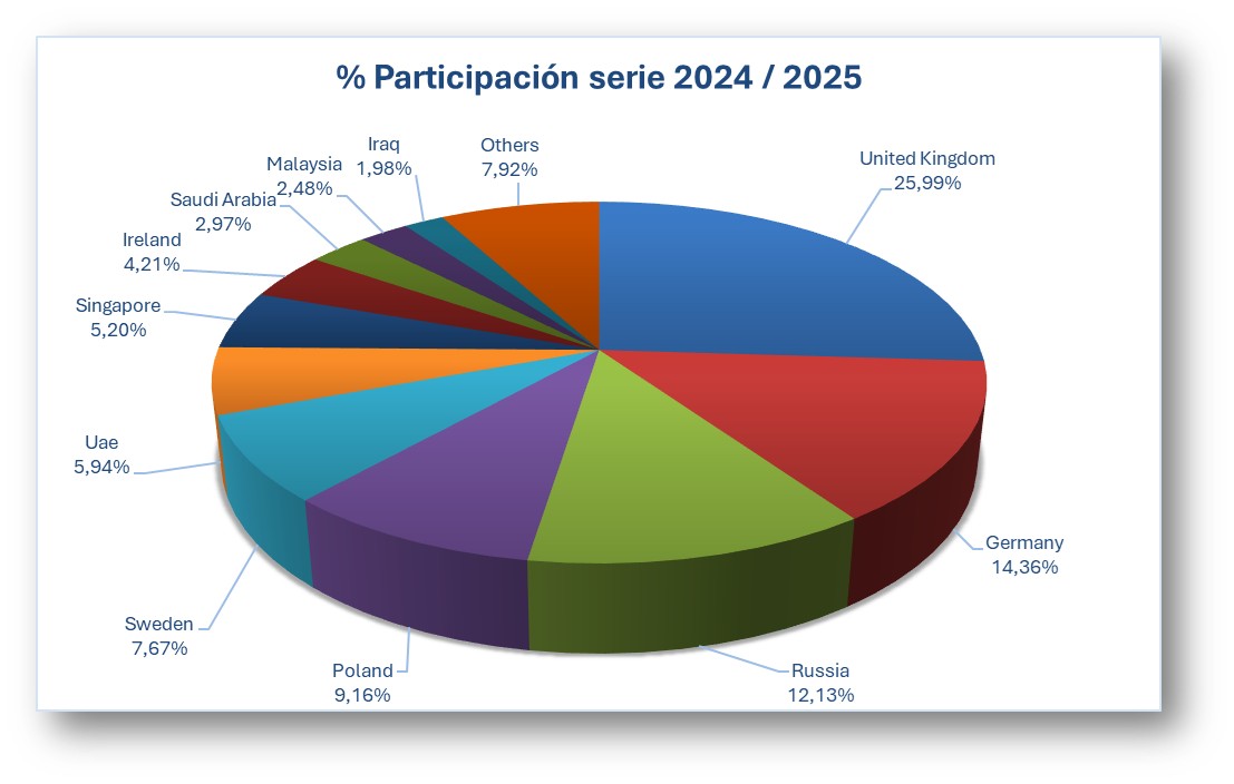 La campaña 2024/25 marcó un reordenamiento interesante. El Reino Unido lideró con el 26% de participación, seguido de Alemania (14%), Rusia (12%) y Polonia (9%). En conjunto, Polonia y Rusia representaron más de una quinta parte de los envíos, confirmando el creciente interés en Europa del Este.