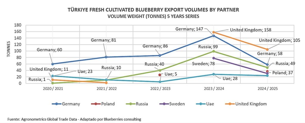 En cinco campañas, Turquía ha colocado 1.708 toneladas de arándanos en el mercado internacional, con Alemania y Reino Unido como principales compradores: juntos concentran casi el 42 % del total acumulado. Otros destinos destacados son Rusia (199 t), Suecia (109 t), Países Bajos (104 t), Emiratos Árabes Unidos (91 t) y Singapur (84 t), además de envíos menores a Irak y Polonia.